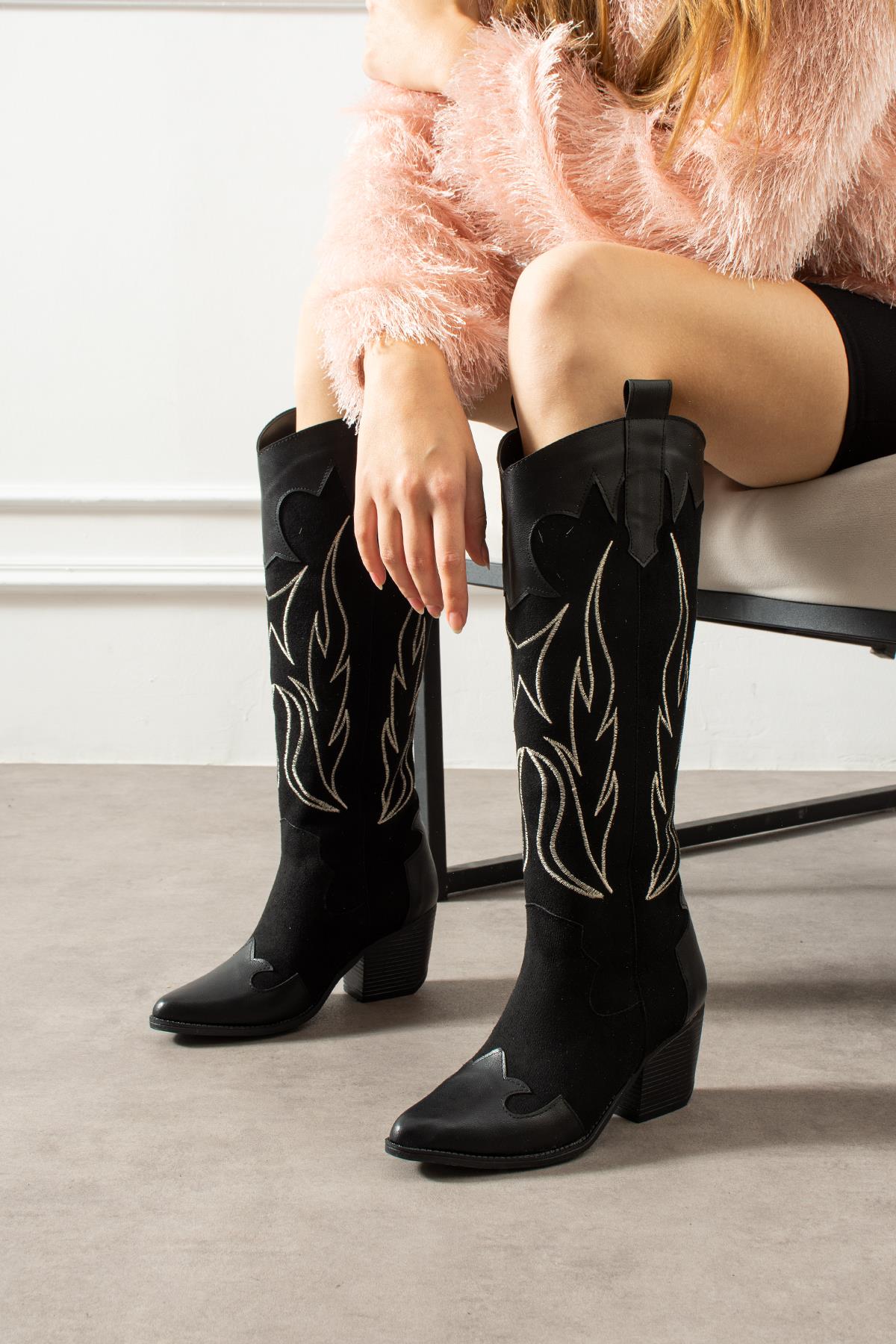SHOETEK Alvest Kadın Kovboy Çizme Dikiş Desenli Siyah Süet/Siyah Deri (Alvest)