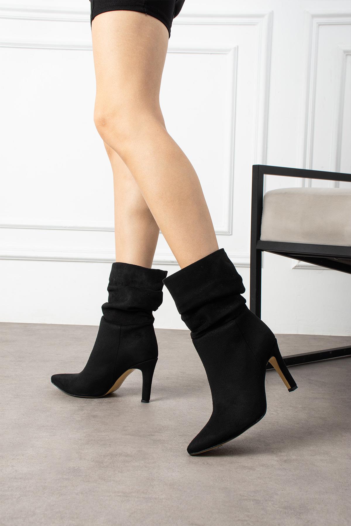 Shoetek Lamirsa Kadın Bot&Bootie Körüklü İnce Topuklu Siyah Süet (Lamirsa)