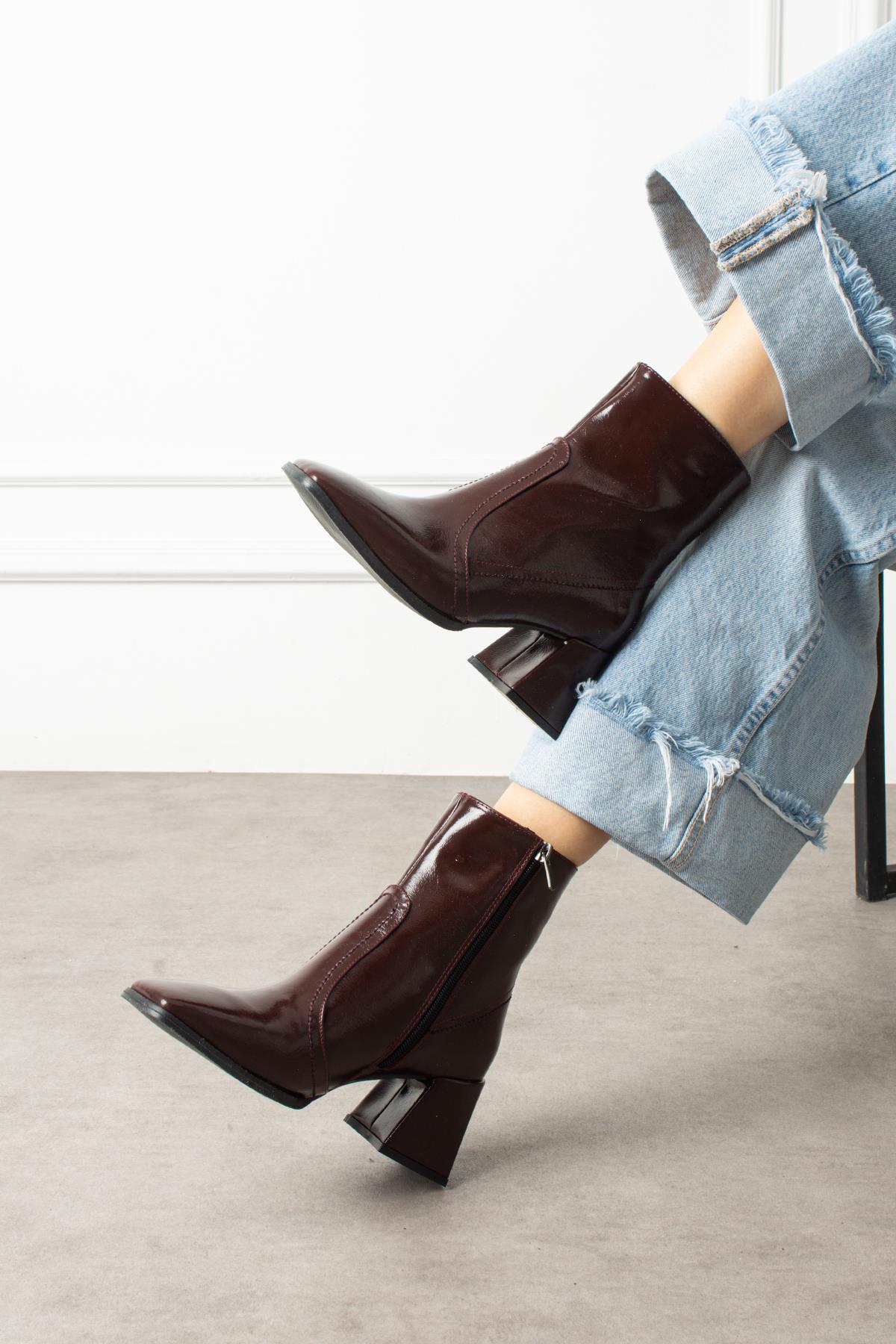 SHOETEK Lossa Kadın Bot Kalın Topuklu Fermuarlı Kırışık Bordo Rugan (Lossa)