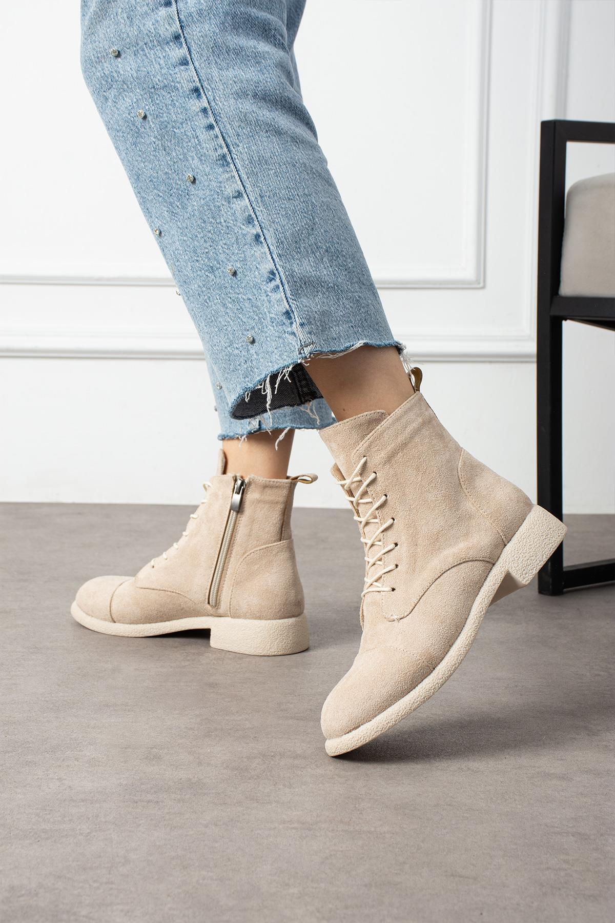 Shoetek Marcello Kadın Bot&Bootie Kauçuk Tabanlı Bağcıklı Bej Süet (Marcello)