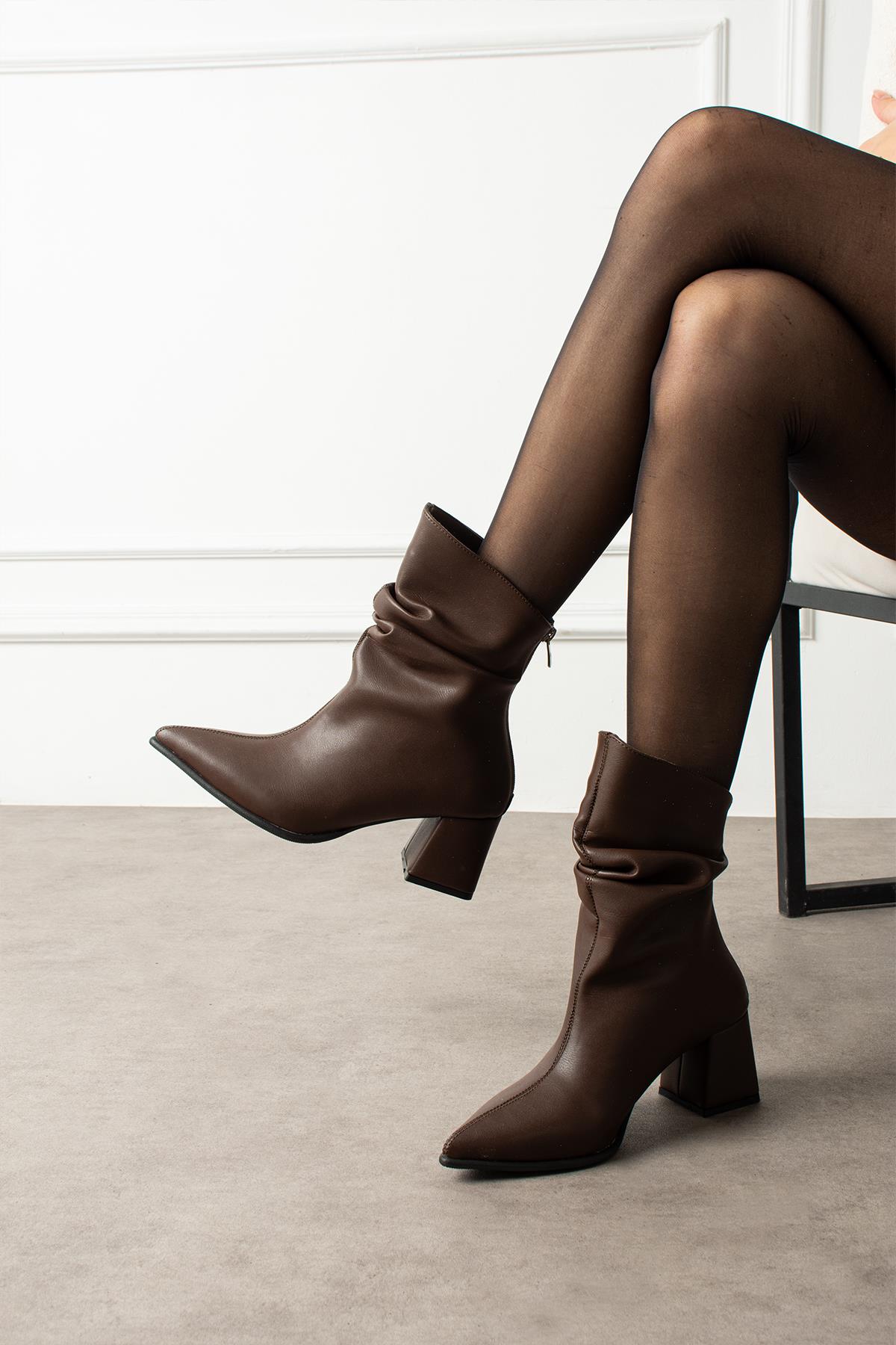 SHOETEK Nutty Kadın Bot Kalın Topuklu Arkadan Fermuarlı Körüklü Kahve Deri (Nutty)