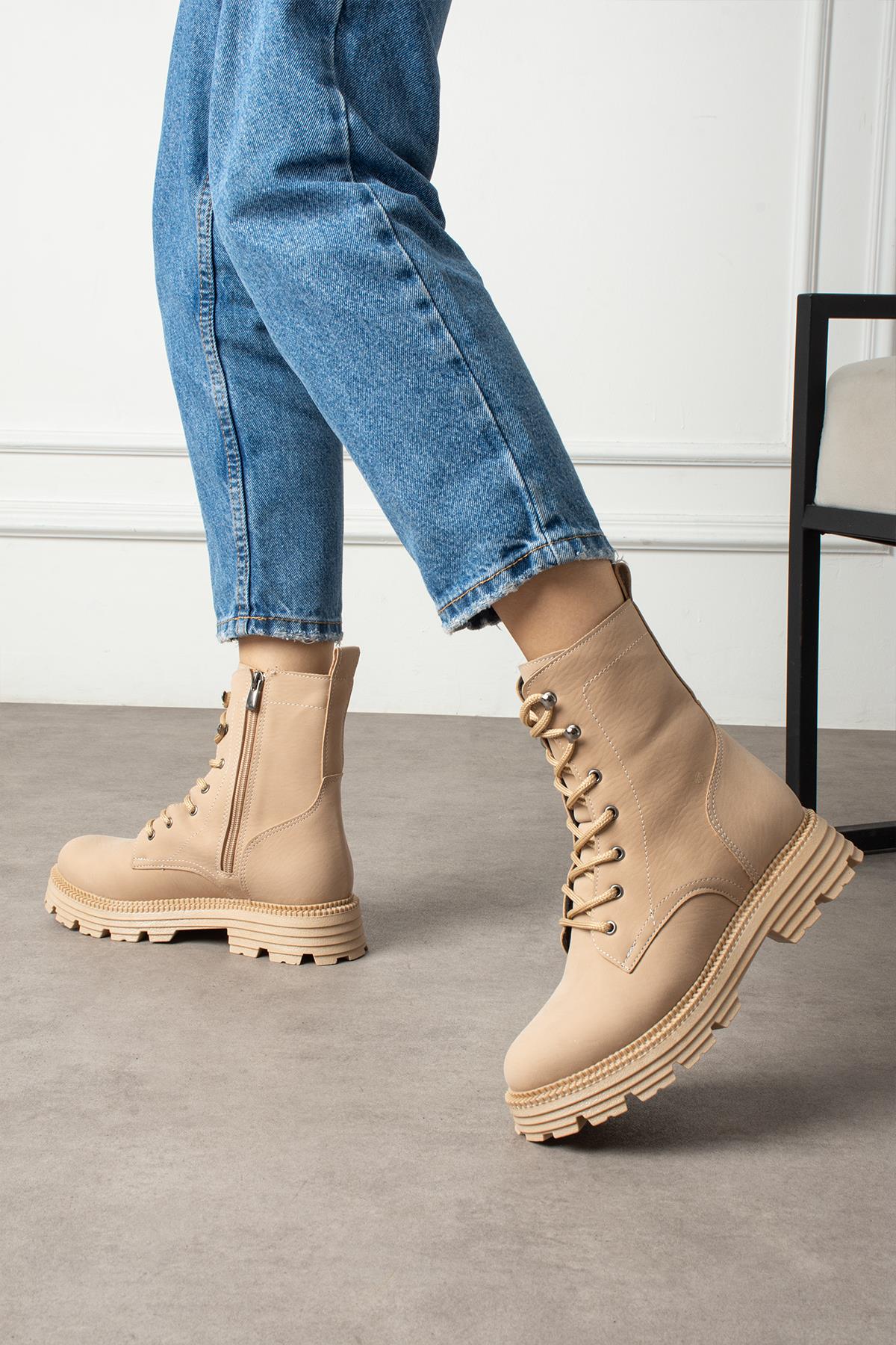 SHOETEK Olsima Kadın Bot Bağcıklı Fermuarlı Mat Nut Deri (Olsima)