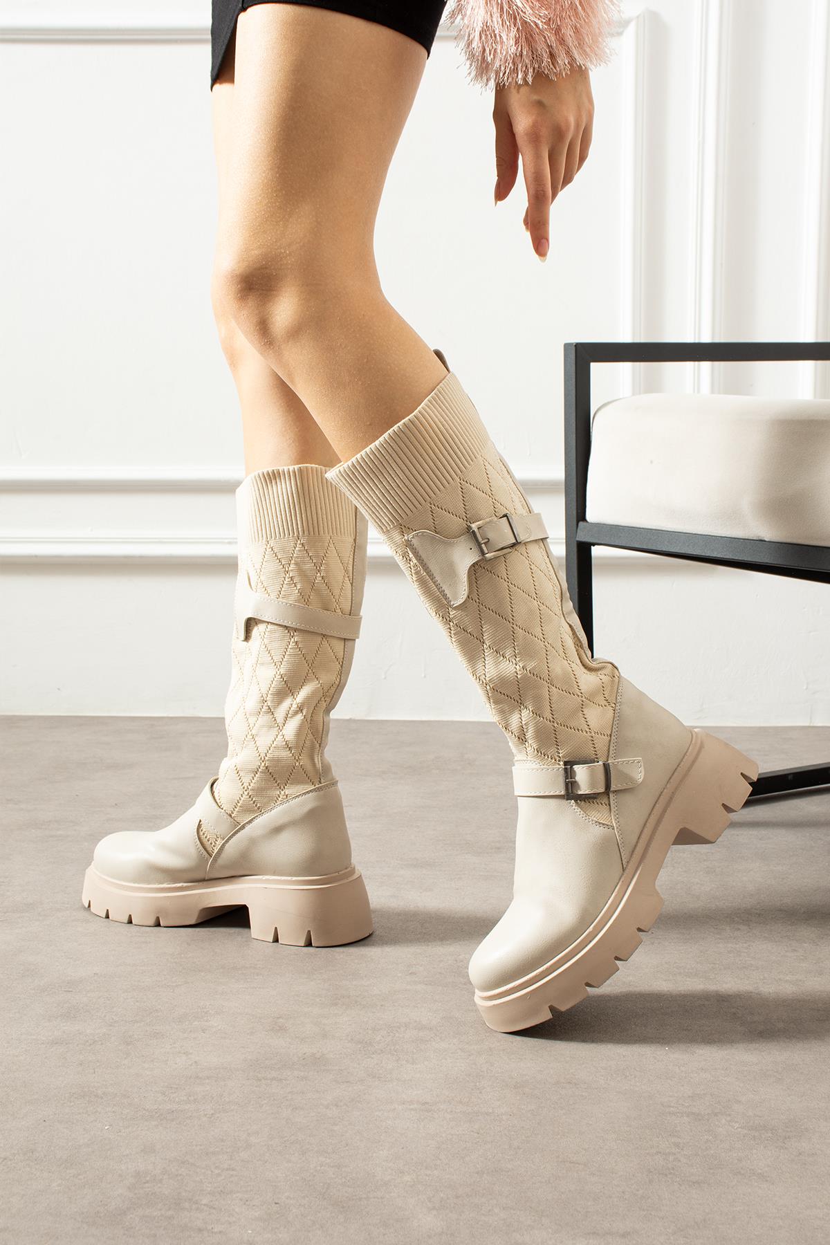 SHOETEK Panve Kadın Çizme Bacak Triko Dokumalı Kamer Tokalı Bej (Panve)